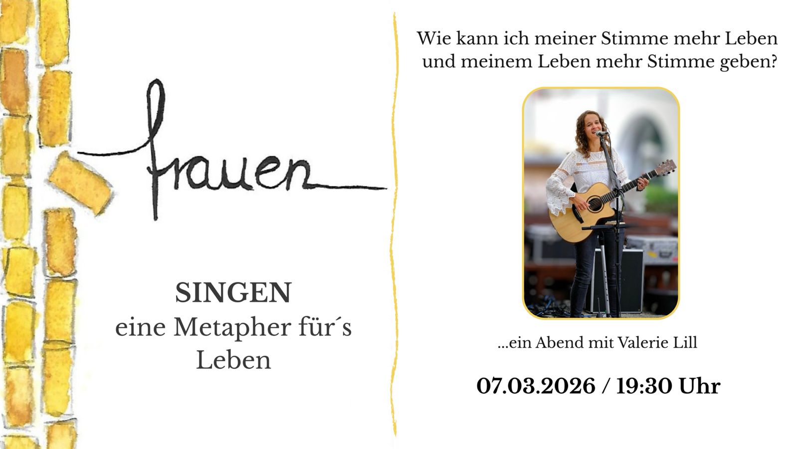 Singen - eine Metapher fürs Leben. Unter diesem Titel wird die Künstlerin Valerie Lill die Frauen an diesem Abend auf eine musikalische und sprachliche Reise mitnehmen. Singen kann uns berühren und öffnen. Das kann an diesem Abend erlebt werden. Wer auf der Suche danach ist, wie man dem Leben mehr Stimme geben kann, ist herzlich eingeladen. Am Sonntag, den 08. März wird Valrie Lill zusammen mit Dirk Benner zusätzlich den Gottesdienst um 10:00 Uhr gestalten. |