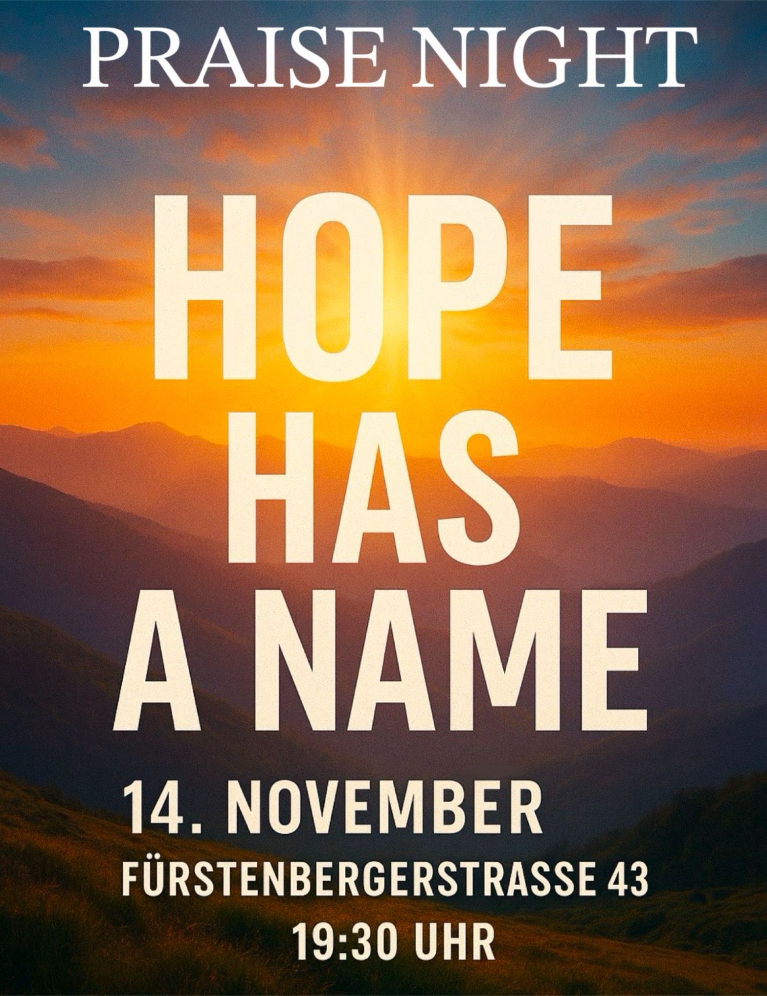 Tauche ein die die Gegenwart Gottes bei guter Musik und starker Gemeinschaft. Das diesjährige Thema ist die Hoffnung und wir sind überzeugt davon, dass Gott Hoffnung schenkt. Diese Botschaft soll die Menschen erreichen. Herzliche Einladung! |