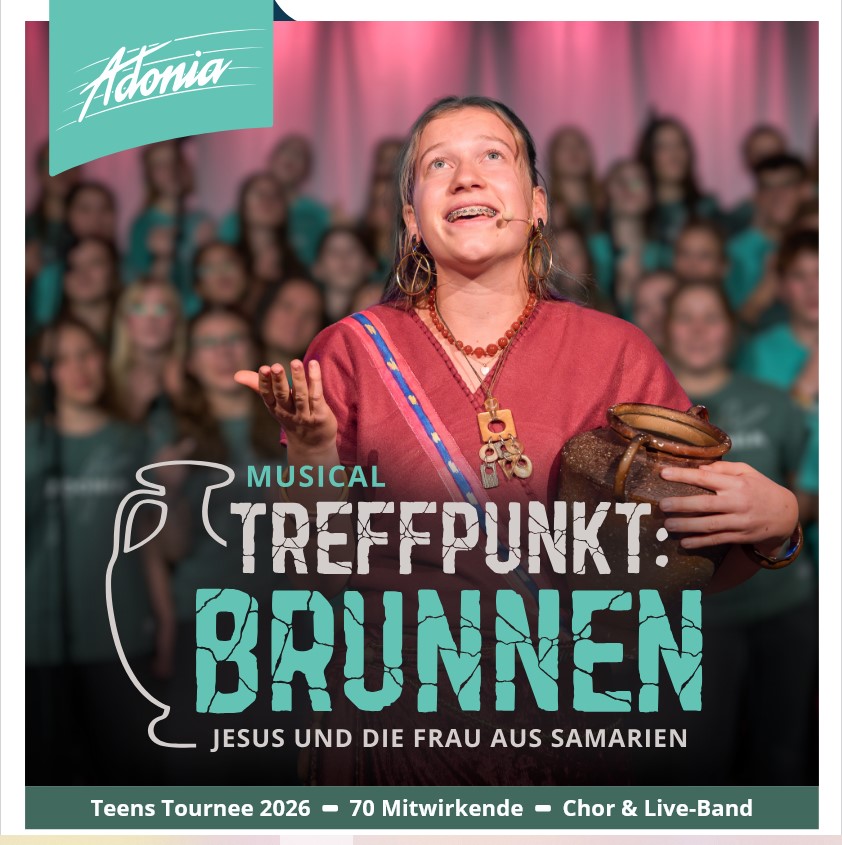Theater und Tanz, eine coole Projektband und ein großer Chor – das ist Adonia. Die 70 Mitwirkenden haben sich für ein Musicalcamp angemeldet und vor zwei Monaten Album und Noten des Musicals erhalten, um die Lieder bereits zuhause zu üben. In einem intensiven Probecamp wird das 90-minütige Programm einstudiert. Und das Ergebnis ist erstaunlich: Die Jugendlichen sind nicht nur hoch motiviert und begabt, ihre Auftritte begeistern auch durch eine hohe Professionalität.